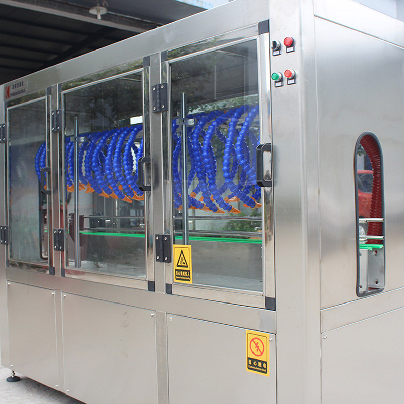 該機(jī)采用高達(dá)280M/H的高強(qiáng)熱風(fēng)流對(duì)瓶體表面的水、殘液進(jìn)行霧化、吹干。此機(jī)采用非接觸式烘干,避免了傳統(tǒng)烘干機(jī)與毛刷機(jī)對(duì)瓶體的二次污染。該機(jī)采用風(fēng)刀式烘干原理,當(dāng)瓶子經(jīng)輸送帶輸送通過烘干機(jī)的風(fēng)刀時(shí),瓶體上的水或殘液在高強(qiáng)熱風(fēng)的作用下吹散、烘干。